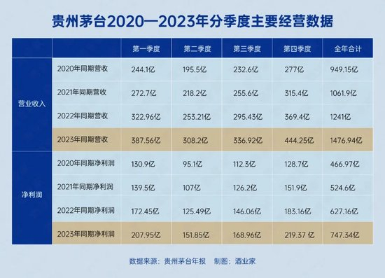 年报显示,过去一年,茅台实现营收1476.94亿(注:非营业总收入),结合前三季度的数据来看,在第四季度,茅台单季度实现营收达到了444.25亿,这也是茅台首次单季度营收跨过400亿大关,另一方面,茅台也在全年的四个季度营收均超过了300亿。