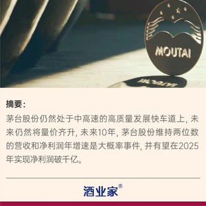 最新发布的《2023-2024中国酱酒产业报告》也显示,茅台股份仍然处于中高速的高质量发展快车道上,未来仍然将量价齐升,未来10年,茅台股份维持两位数的营收和净利润年增速是大概率事件,并有望在2025年实现净利润破千亿。