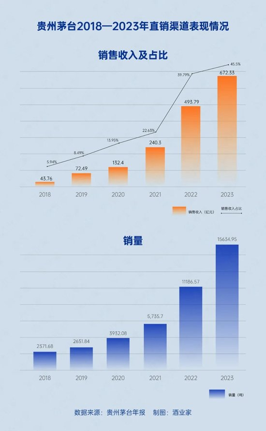 值得注意的是,近年来发展迅猛的直销渠道,也对茅台“价增”做出了重要贡献。年报显示,2023年,茅台在直销渠道的销量达到了15634.95吨,实现销售收入672.33亿元,同比增长36.16%,在整个营收中的占比也超过了45.5%,创下历年来的新高。