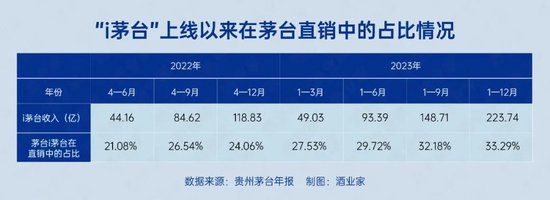 最新数据显示,截至到目前,i茅台的注册用户已经突破了6500万,而截至2023年年底,i茅台的日活达到了500万。更为重要的是,根据茅台2023年年报显示,i茅台在2023年实现营收223.74亿,同比增长88.29%。这一数据在整个茅台直销中的占比已经达到了三分之一。而算上2022年的数据来看,i茅台在上线后的7个季度中,累计实现营收更是达到了342.57亿。