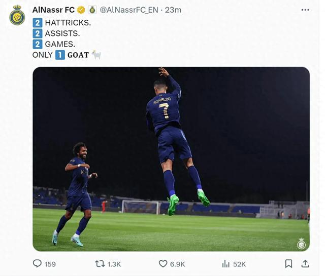 面对队内头牌如此绝佳的表现,利雅得胜利俱乐部也在社交媒体上发文表示:“2场比赛,2次帽子戏法、2个助攻,只有1个GOAT!”