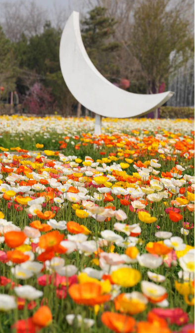 除了五彩缤纷的冰岛虞美人,金黄色的油菜花、梦幻的二月兰、魔毯般蔓延的芝樱等花卉也争相盛开,红黄映衬,紫白相间,超大片的花海明媚绚丽,伴着喷泉、水车、风车、钢琴、罗马柱等景观,仿若置身现实版“莫奈花园”。