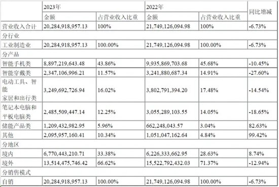 以智能穿戴设备类业务为例,IDC最新报告显示,2023年全球可穿戴设备出货量年增长1.7%,但公司智能穿戴类业务收入却下滑27.60%。、