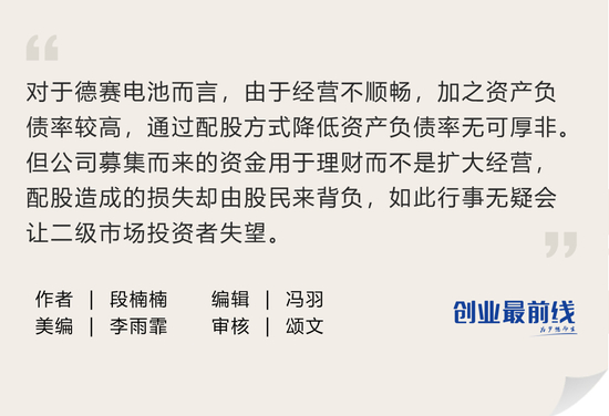 对于德赛电池而言,由于经营不顺畅,加之资产负债率较高,通过配股方式降低资产负债率无可厚非。但公司募集而来的资金用于理财而不是扩大经营,配股造成的损失却由股民来背负,如此行事无疑会让二级市场投资者失望。
