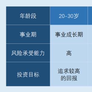 需要指出的是,每个年龄段下投资者的财务状况、风险承受能力都有一定不同。比如,处于事业成长期的投资者,事业的成长空间充分,且有财富增长的需求,在投资方面可能会偏向激进;处于事业稳定期的投资者,可能需要为子女的教育和自己的退休生活进行储蓄,在投资上注重稳健性;对于已进入退休生活的投资者而言,资金的安全性或会被放在第一位。