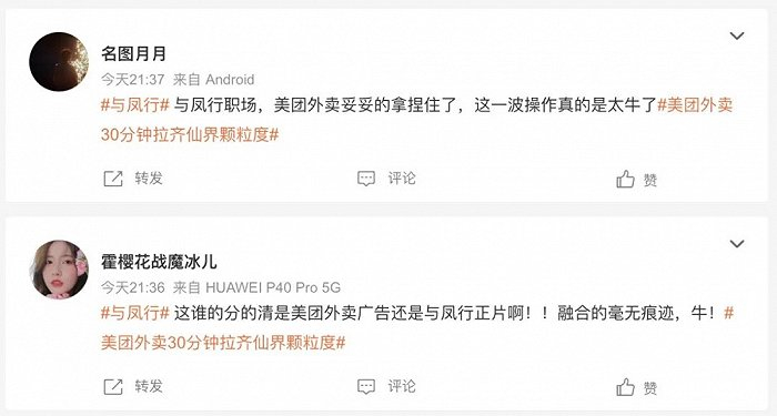 除了开头所提讨论度颇高的百花宴,当《与凤行》行止和碧苍王沈璃为保护灵界疑似葬身东海的催泪剧情时,观众们为女主落泪、担忧在社媒平台齐发感悟小作文的时间点,美团外卖也精准选中了该剧情爆点投放了相关素材。