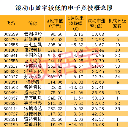 9只电竞概念股市盈率不足30倍