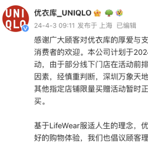优衣库:取消深圳万象天地店、成都国际金融中心店限量买赠活动