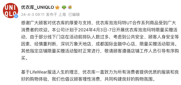 4月3日,优衣库官方微博发布消息称,公司计划于2024年4月3日-7日开展优衣库泡泡玛特限量买赠活动,由于部分线下门店在活动前排队人数过多,考虑到公共安全、顾客人身安全等因素,经慎重判断,深圳万象天地店,成都国际金融中心店,限量买赠活动取消。其他指定店铺限量买赠活动暂时正常进行,敬请顾客遵循店铺工作人员引导有序购买。