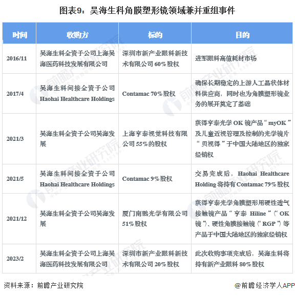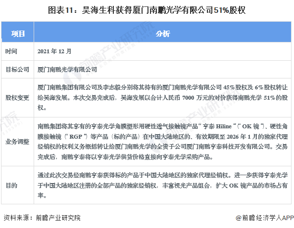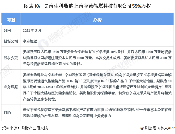 昊海生科对亨泰视觉、厦门南鹏光学的两次收购是行业较具代表性兼并重组事件。两次收购进一步获得亨泰光学于中国大陆地区注册的全部产品的独家经销权,丰富公司视光产品组合,快速扩大了昊海生科在国内角膜塑形镜的市场占有率。