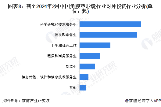 从投融资情况看,我国角膜塑形镜研发制造企业数量较少,投融资事件较少,投融资市场热度较低;从对外投资情况看,对外投资次数“先升后降”,2018年达到历史最高值,科学研究和技术服务业为热门投资行业;从兼并重组情况看,兼并重组是企业进入角膜塑形镜行业、扩大市场占有率的重要手段,昊海生科对亨泰视觉、厦门南鹏光学的两次收购快速进入市场,扩大市占率。
