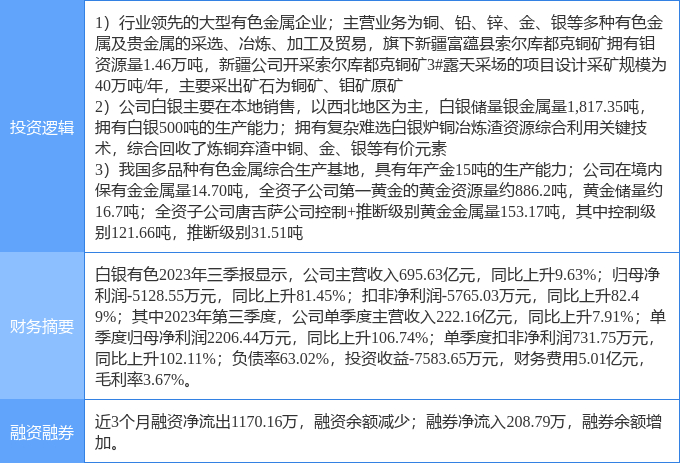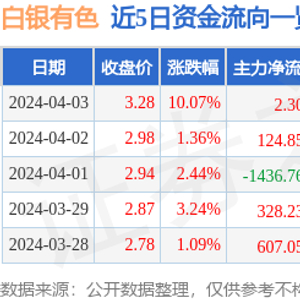 证券之星消息,白银有色涨停收盘,收盘价3.28元。该股于9点54分涨停,1次打开涨停,截止收盘封单资金为6269.67万元,占其流通市值0.26%。