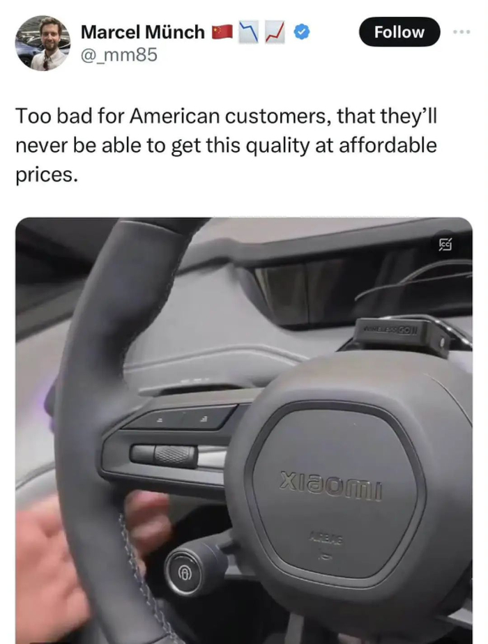 而海外的网友就更直白了,直言“这对美国消费者而言可是个坏消息,他们永远没可能以可负担的价格,买到这种品质的车…”