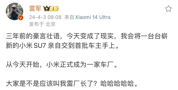 看得出来,雷军也非常别激动,一早发了条微博,调侃称“大家是不是应该叫我雷厂长了?哈哈哈哈哈。”