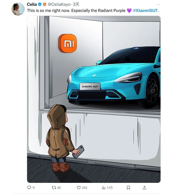 还有对小米SU7喜爱的网友丝毫不吝啬表达自己对新车的喜爱:“如果将图中的车换成霞光紫,那么我就是那个在橱窗前的小孩。”