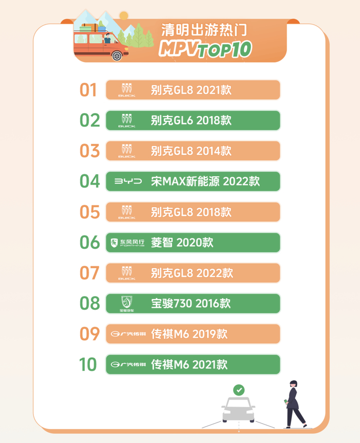 为方便清明出游,不少消费者计划购入一辆大空间的车子,然后规划出游目的地和节奏,避开喧嚣的人流,去小众旅游目的地享受惬意的假期。因此,7座及以上的大空间车型就成了清明出行购车的首选,此时在瓜子购车还能在假期出游时试驾7天,看看空间、动力、装载是否满足需求。报告显示,7座、9座车清明期间搜索热度高于日常3倍,MPV二手车销量预计同比增加79%。
