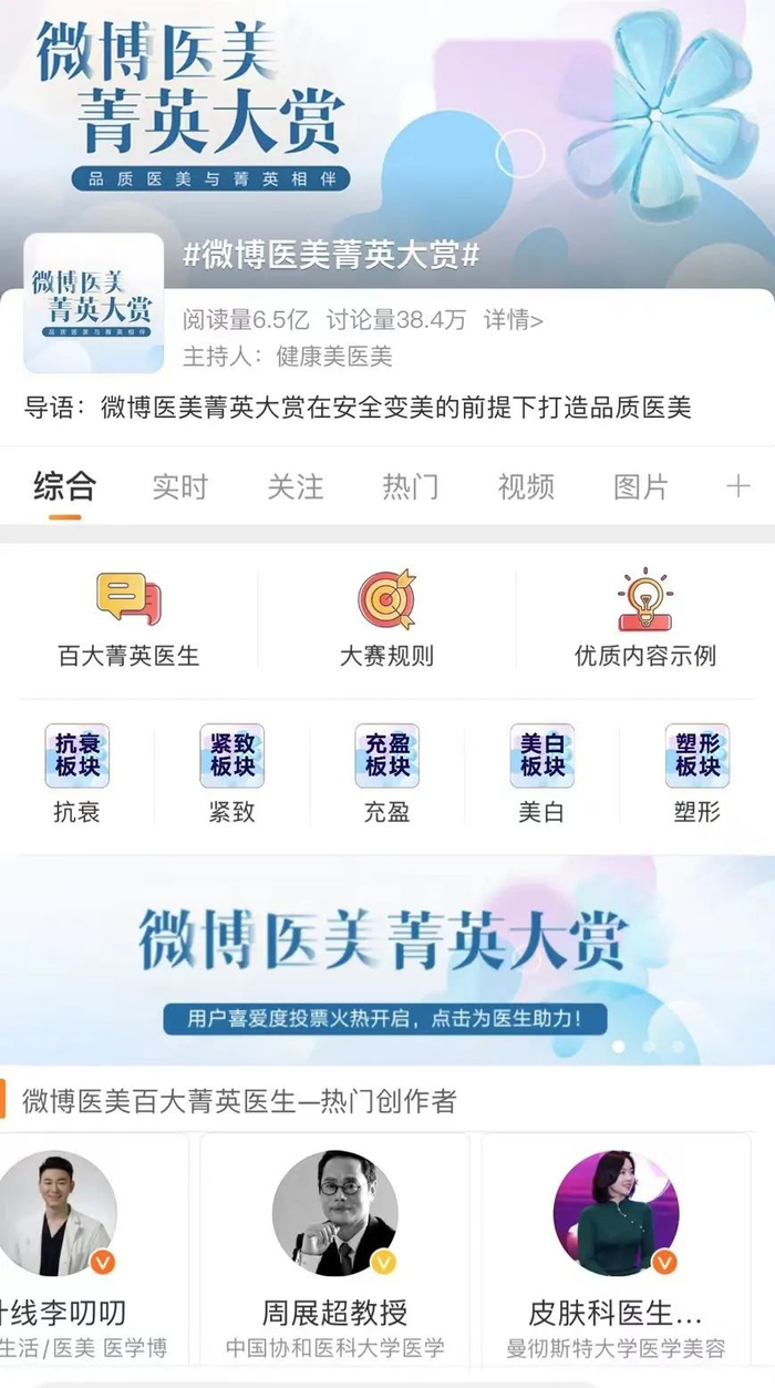 例如微博刚收官的2023医美百大菁英医生大赏,有着近5万条优质的原创科普输出,话题阅读量总计达到6.5亿,互动量高达110.4万。“微博医美菁英大赏”做的事情就是在中国整形协会行业发展与监督自律委员会指导下,汇聚更多优秀的医生,做好权威专业的医疗美容科普。