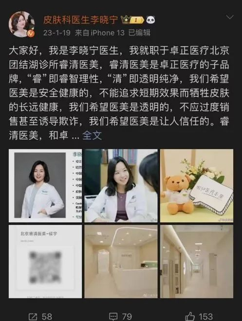 李晓宁,是一位皮肤科医生,同时也是一位喜欢分享的资深社交媒体使用者,微博就成为她内容输出的重要平台。各种皮肤病的科学科普、日常读到的学科文献、关于注射产品的解读、面部解剖及审美等,想到什么看到什么都会发表在微博,在这个输出的过程中逐渐得到了越来越多医生和求美者的关注和互动。