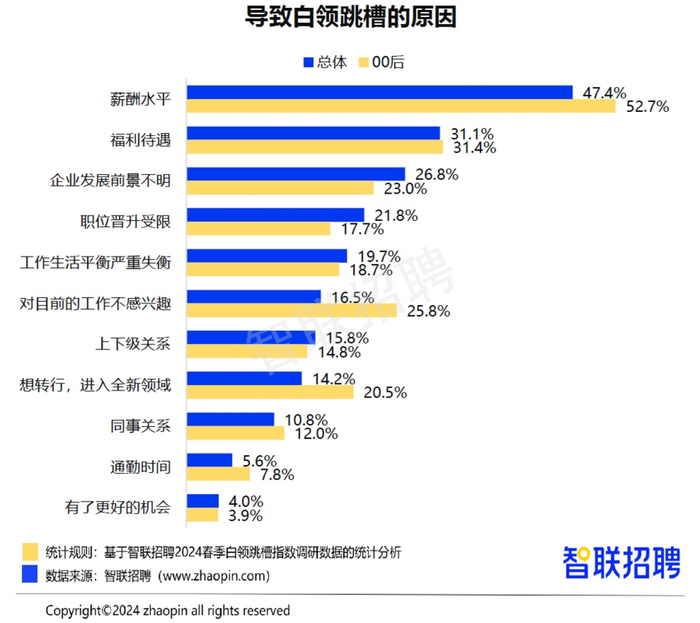 跳槽是为了寻求更好的发展,而收入则拿捏着打工人的命脉。不出意外,薪酬成为白领们跳槽的首要因素。调查显示,2024年春季白领跳槽的首要原因仍是薪酬水平,占比达47.4%,较去年的53.6%有所下降。