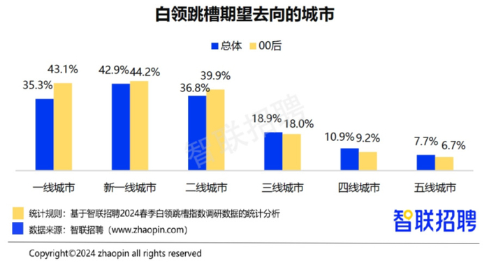 跳槽,正在成为职场人寻求个人发展的一种方式。日前,智联招聘发布《2024春季白领跳槽指数调研报告》(下称《报告》),对全国核心城市白领展开调研,从白领的跳槽意愿及行为、生活状态等方面入手,重点分析了与跳槽相关的各项因素。聚焦就业领域,跳槽是否是一场“骑驴找马”的豪赌?在“去”与“留”的选项中,白领们会做出怎样的选择?00后这一年轻群体又传达出了怎样的风向?