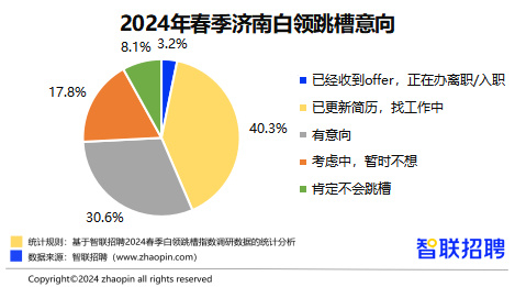 虽然跳槽意愿下降,今年春招季有跳槽意愿或行为的白领仍有近8成。《报告》数据显示,全国有45.4%的白领表示“已更新简历,找工作中”,27.3%的白领“有意向”跳槽,也有5.5%的白领“已经收到offer,正在办离职/入职”。以济南为例,40.3%的济南白领表示正在找工作,占比低于去年的59%,有30.6%的济南白领有意向跳槽但尚未行动,较去年同期的31.3%有所下降。可见,济南白领跳槽的实际行动、观望情绪都有所缩减。