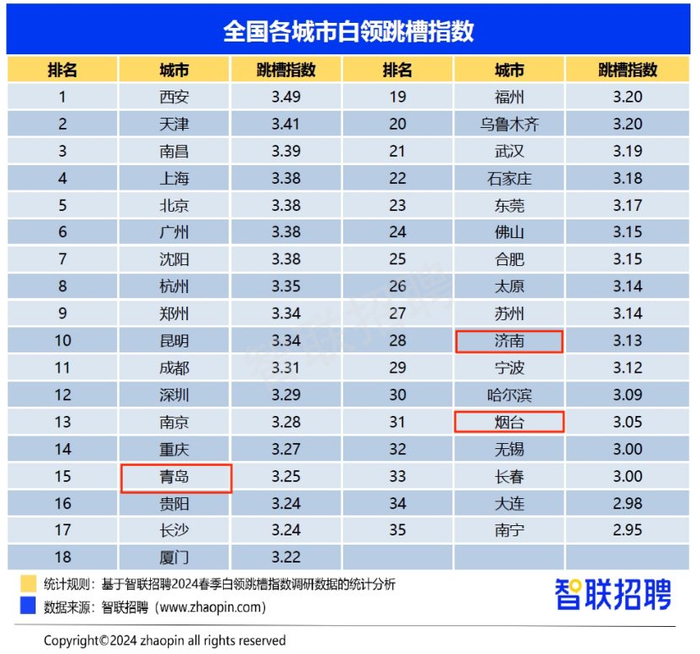 跳槽指数,用来表示群体跳槽的意愿,指数越高则代表跳槽的意愿越强。智联招聘调研数据显示,2024年白领跳槽指数为3.29,比2023年的3.65、2022年的3.63有所下降,这说明白领整体“稳住”的心态更强烈,跳槽意愿有所下降。在全国各城市白领跳槽指数榜单中,山东共有三市上榜,跳槽指数均低于全国平均水平3.29,其中青岛以3.25的跳槽指数在三市中领先。