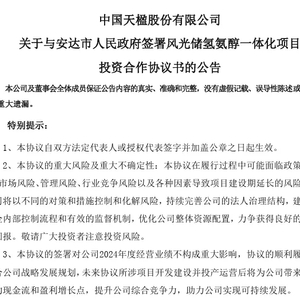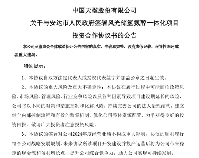 年产62万吨甲醇、10万吨绿氢!中国天楹正式签订黑龙江风光储氢氨醇一体化项目
