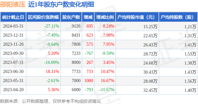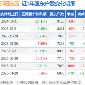 从股价来看,2023年12月31日至2024年3月31日,邵阳液压区间跌幅为27.11%,在此期间股东户数增加695.0户,增幅为8.24%。
