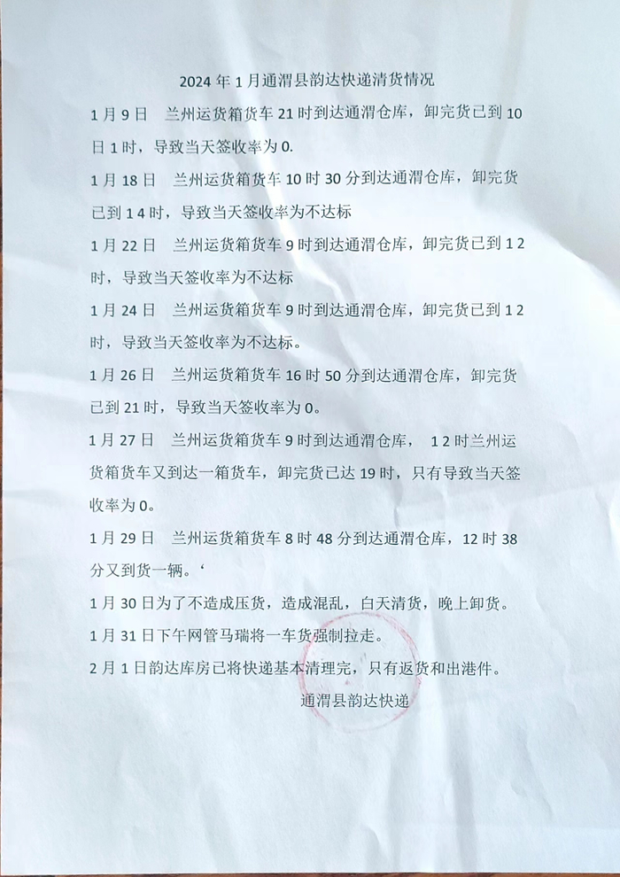 记者从常小利提供的“2024年1月通渭县韵达快递清货情况”单中看到,其公司早在1月9日就出现了当天签收率为0的情况,“这一天主要是因为省公司货车司机罢工的原因导致的。”随后18日至31日期间,又相继出现了多次签收率不达标或为“0”的现象。