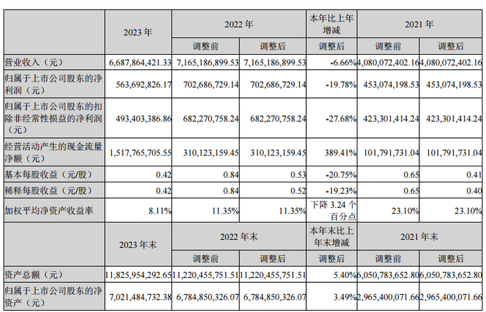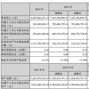 金力永磁3月29日披露的2023年年报显示:2023年初以来稀土原材料价格产生较大幅度波动。公司管理层及时采取应对策略,把握市场机遇,稳定经营。2023年度公司高性能稀土永磁材料总销量15,122吨,较上年同期增长25.60%。同时公司持续加大在磁材、磁组件及机器人自动化方面的研发投入,2023年度公司研发费用3.54亿元,较上年同期增长4.86%,占营业收入的比例为5.29%。报告期内,公司持续聚焦新能源和节能环保领域,专注于新能源汽车及汽车零部件、节能变频空调、风力发电、3C、机器人及工业伺服电机、节能电梯等核心应用领域。2023年度,公司实现营业收入668,786.44万元,同比下降6.66%;境内销售收入543,864.22万元,同比下降14.30%,境外销售收入124,922.22万元,同比增长52.57%;实现归属于上市公司股东的净利润56,369.28万元,同比下降19.78%;实现归属于上市公司股东的扣除非经常性损益的净利润49,340.34万元,同比下降27.68%;扣除2022年度因港股上市融资取得的汇兑收益1.5亿元及本年新增研发费用1,640万元等因素影响,2023年度公司净利润较2022年度基本保持稳定。公司2023年年度利润分配预案为:拟向全体股东每10股派2.6元(含税)。