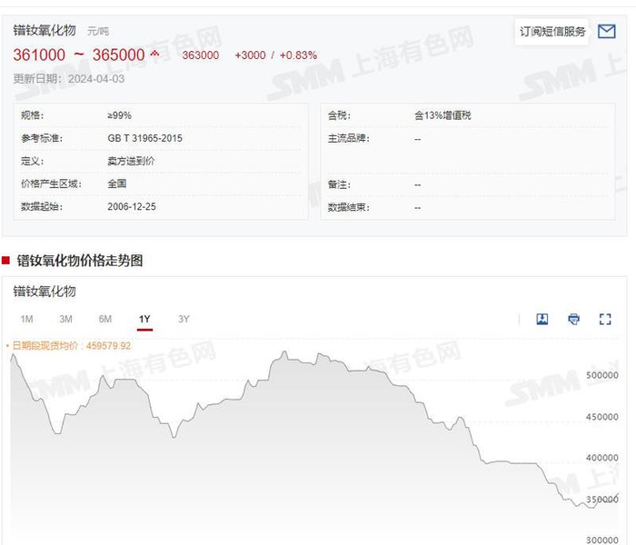 4月3日,据SMM的报价显示,轻稀土方面:氧化镨钕均价为363000元/吨,较前一交易日涨3000元/吨,涨幅为0.83%;中重稀土方面:氧化镝的均价为1880元/千克,较前一交易日涨45元/千克,涨幅为2.45%;氧化铽的均价为5575元/千克,较前一交易日涨100元/千克,涨幅为1.83%。