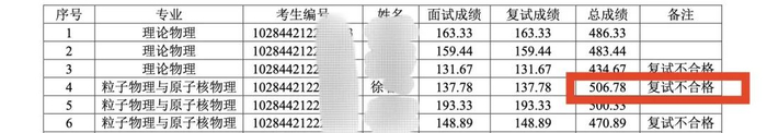 4月3日下午,潇湘晨报记者从南京大学物理学院公示的信息看到,该男子初复试总成绩相加为506.78分,在本次考试中,位于粒子物理与原子核物理专业第一名。学校在其名后备注“复试不合格”。
