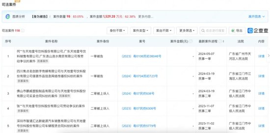 企查查显示,天地壹号涉及司法案件118起,其中83.05%为被告身份,被告案件金额达1529.28万元。