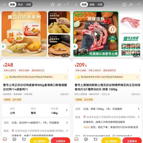 京东页面显示,壹号土猪的排骨肉片3斤209.8元,壹号土鸡2只248元。