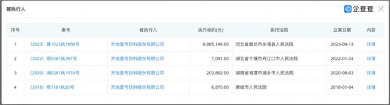 企查查显示,因诉讼纠纷,天地壹号四次成被执行人,被执行金额合计达720.3万元。