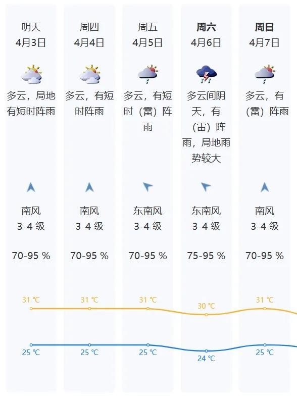 4月3日:多云,局地有短时(雷)阵雨,沿海、高地和海区最大阵风6~7 级,气温 25~31℃;
