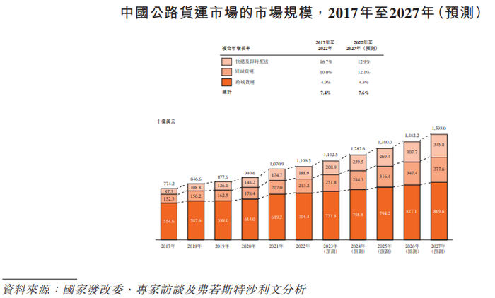 根据弗若斯特沙利文的资料,按GTV计,中国是全球最大的公路货运市场。2022年,中国公路货运市场的GTV为11,065亿美元,占全球市场的31.8%,预计2022年至2027年期间按7.6%的复合年增长率增长。2022年,跨城货运板块的GTV为7,044亿美元,预计于2022年至2027年将按4.3%的复合年增长率稳步增长。