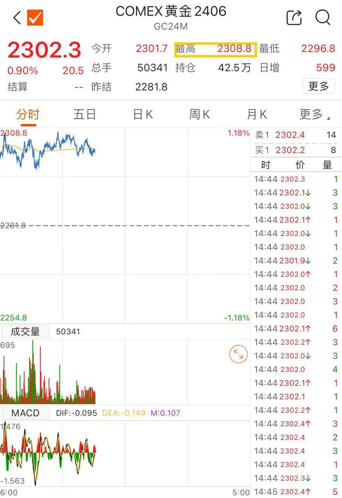 4月3日,国际金价再度突破历史新高,COMEX 6月黄金期货盘中最高冲上2308.8美元/盎司,已连续7个交易日上涨。沪金期货主力合约2406开盘后一路走高,收涨1.87%。A股贵金属板块多只黄金概念股封板涨停。此外,国内足金首饰零售价格也已突破700元/克。