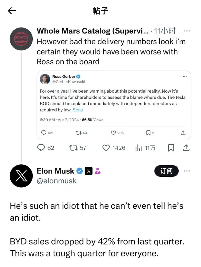 最新数据发布后,特斯拉知名投资者罗伯特·格伯在社交媒体平台X上发帖,对一季度销量下滑进行了猛烈抨击,格伯认为马斯克应为此负责。随后,马斯克发帖回应称“他真是个白痴”并表示“这个季度对每个人来说都很艰难”。