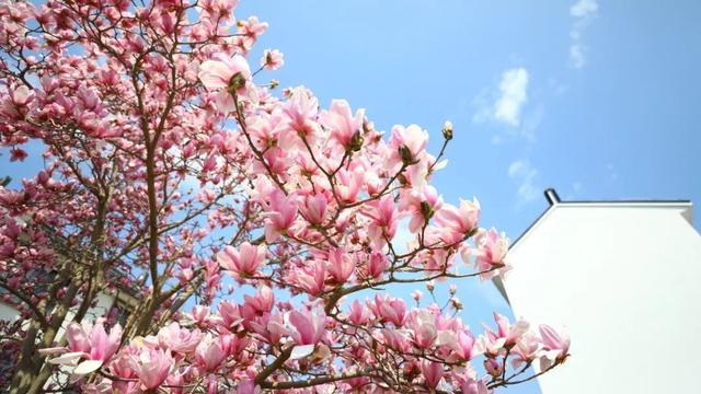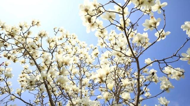此外,紫玉兰、二乔玉兰等品种目前也正值盛花期。花朵沐浴在明媚的春光里,在蓝天白云的映衬下,吸引着过往行人的目光。