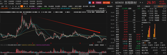 二级市场上,彤程新材自2021年8月历史最高点迄今股价累计最大跌幅达74%。