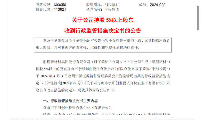 公告显示,宇彤投资作为彤程新材持股5%以上股东,在2021年8月2日至2023年11月2日期间,因主动减持和被动稀释,持有的公司权益比例减少4.76%;在2023年11月2日至11月10日期间,因通过集中竞价方式减持公司股份,持有的公司权益比例继续减少0.25%,累计减少达到5.01%。宇彤投资未按规定及时履行报告、公告义务并停止买卖公司股份,于2023年11月13日至2024年1月4日期间继续通过集中竞价方式减持公司股份,累计变动比例达到5.20%后,于2024年1月4日披露简式权益变动报告书。上述行为违反了《中华人民共和国证券法》第六十三条第二款的相关规定,上海监管局决定对宇彤投资采取责令改正的行政监管措施。