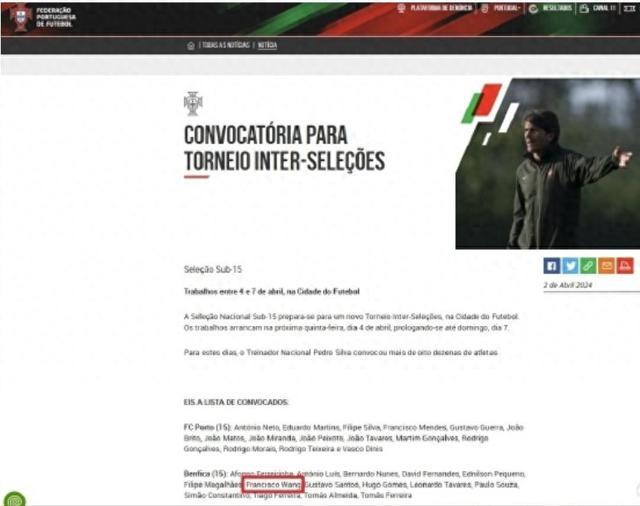 在中国足协有意归化沧州雄狮外援奥斯卡的时候,其他国家的足协也正在抢先招揽在海外踢球的华裔球员。近日,葡萄牙足协官宣了4月4日至7日的葡萄牙U15国少队集训名单,葡超豪门本菲卡U15B队的10号球员王磊就榜上有名!