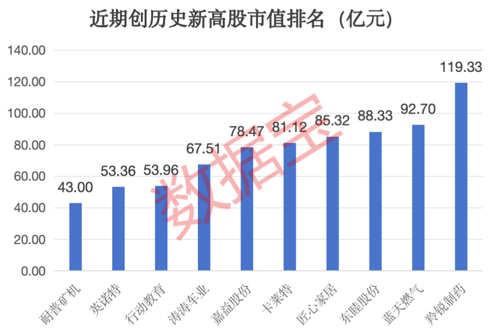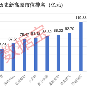 从市值角度看,农业银行、中国移动、中国银行、建设银行等个股市值超万亿元,中国海油、中国神华、长江电力等个股市值超5000亿元。市值最低的个股是耐普矿机,不足50亿元。此外,英诺特、行动教育、涛涛车业等8股市值不足百亿元。