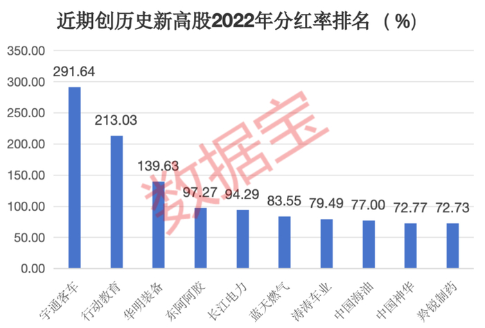 令人意外的是,蓝天燃气最新市值不足百亿元,堪称未来高分红的黑马股。公司去年拟每10股派现8.5元,分红率超过97%,最新股息率超6%。部分未来潜在高分红公司还有东阿阿胶、长江电力、中国海油、羚锐制药等,2022年派现率均超70%。