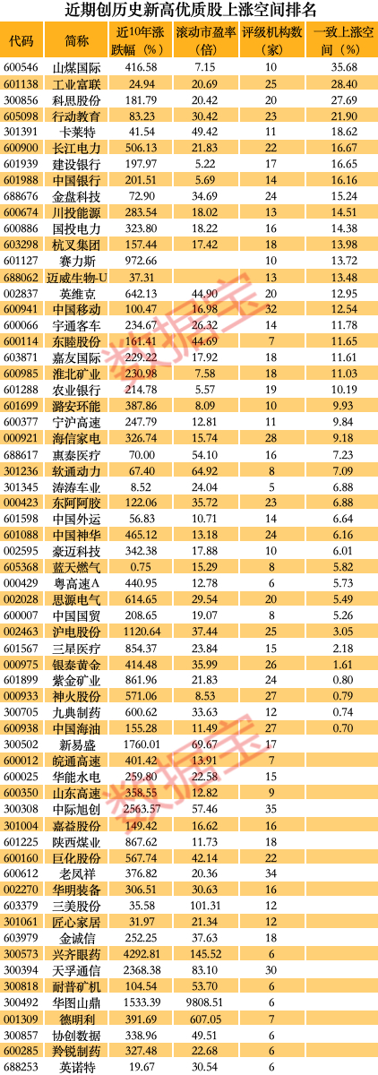 相比机构一致预测目标价,山煤国际、工业富联、科思股份、行动教育等个股上涨空间均超20%。山煤国际上涨空间近36%居首,主要是该股近期调整幅度较大。科思股份为本周股价创历史新高,上涨空间接近28%。浙商证券认为公司作为传统防晒剂龙头,近年加速新型防晒剂和个护产品布局及产能拓展,并受益于竞争格局优化,看好其向个护原料平台迈进。