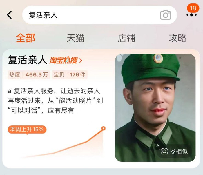 4月3日,记者在多个电商平台搜索发现,AI复活类商品的定价从10元左右到千元不等,所提供的服务也从单纯让照片变动态衍生至可自主对话。根据某电商平台的开放数据显示,与AI复活相关的词条,检索量在本周内上升了15%。