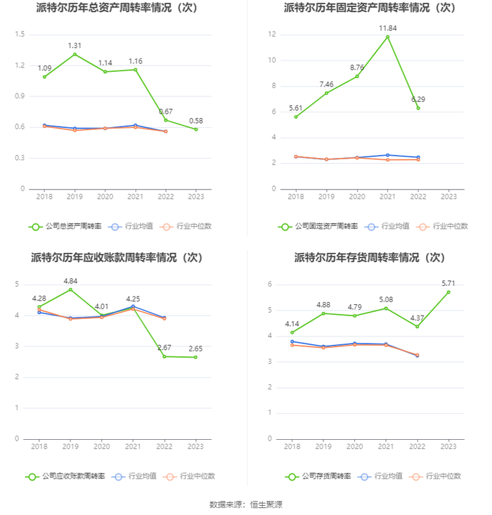 营运能力方面,2023年,公司公司总资产周转率为0.58次,上年同期为0.67次(2022年行业平均值为0.56次,公司位居同行业32/98);公司应收账款周转率、存货周转率分别为2.65次、5.71次。