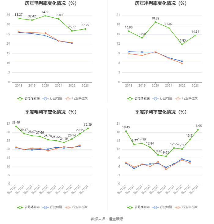 2023年,公司毛利率为27.79%,同比上升1.02个百分点;净利率为14.64%,较上年同期上升2.79个百分点。从单季度指标来看,2023年第四季度公司毛利率为32.39%,同比上升7.17个百分点,环比上升3.24个百分点;净利率为18.95%,较上年同期上升9.32个百分点,较上一季度上升3.44个百分点