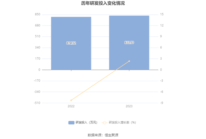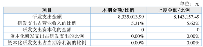 2023年全年,公司研发投入金额为833.50万元,同比增长2.36%;研发投入占营业收入比例为5.31%,相比上年同期下降0.31个百分点。此外,公司全年研发投入资本化率为0。